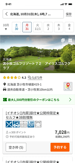 全国約1,900カ所以上のゴルフ場から選べる日本最大級の無料ゴルフ場予約アプリ。希望のエリアや価格、時間帯、アクセスのしやすさなど様々な条件でプランの検索が可能です。さらに、全国のホール写真や動画を見れるギャラリー機能やゴルフ場での手続きが簡単なチェックイン機能、制覇マップなどもご利用いただけます。