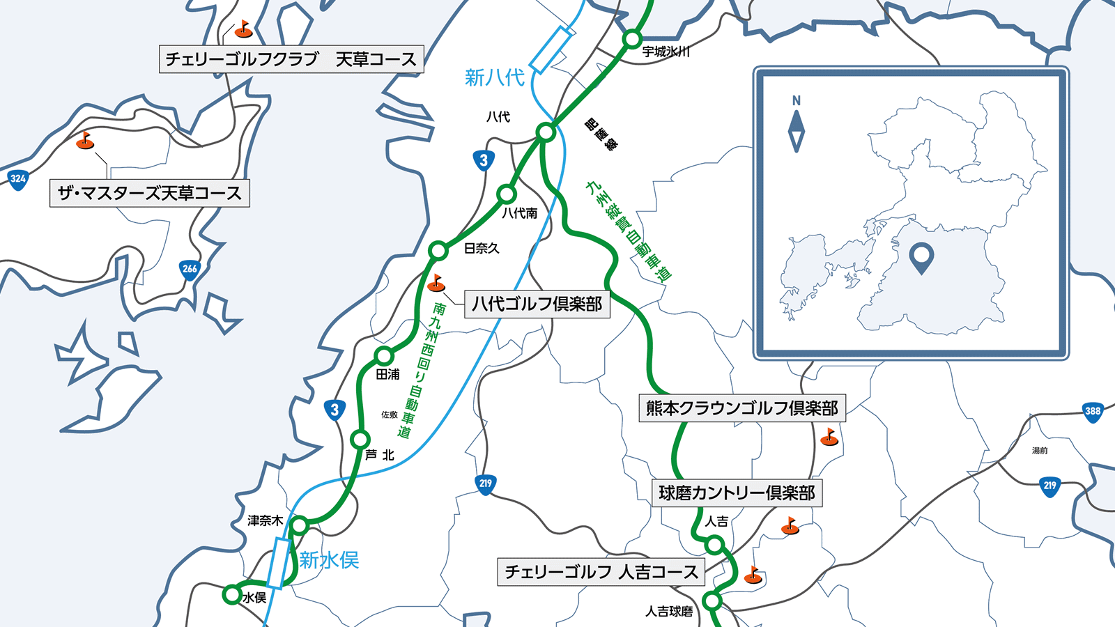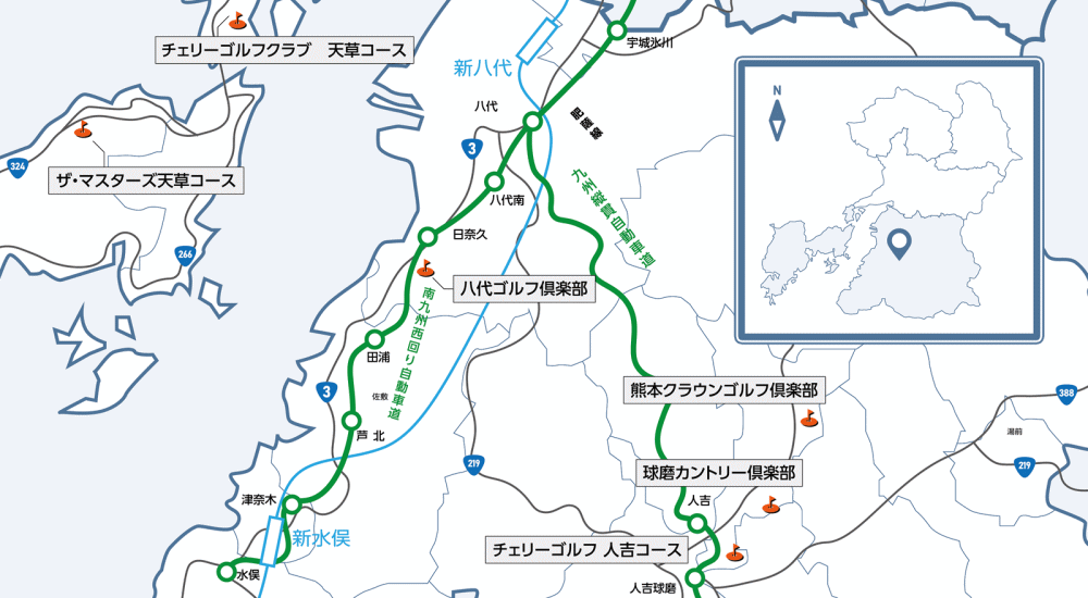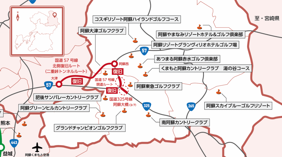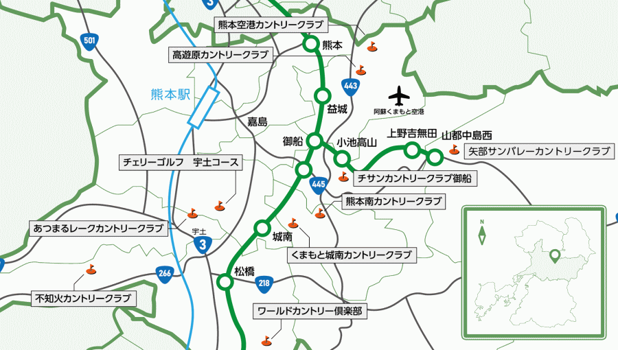 熊本市内、阿蘇くまもと空港からのアクセスに優れる。高原の地形を活かしたテクニカルなチャンピオンシップコースが点在し、県内外の腕自慢たちが集います。九州中央自動車道で、熊本県内の横断も可能に!