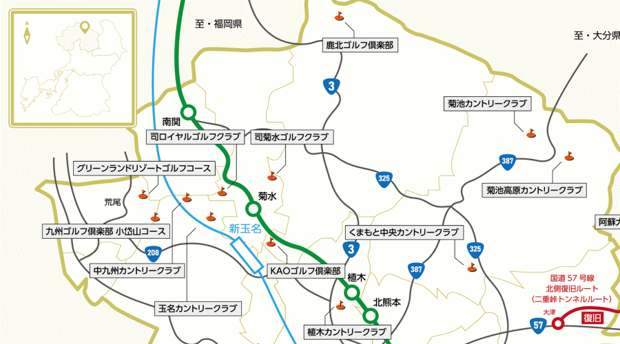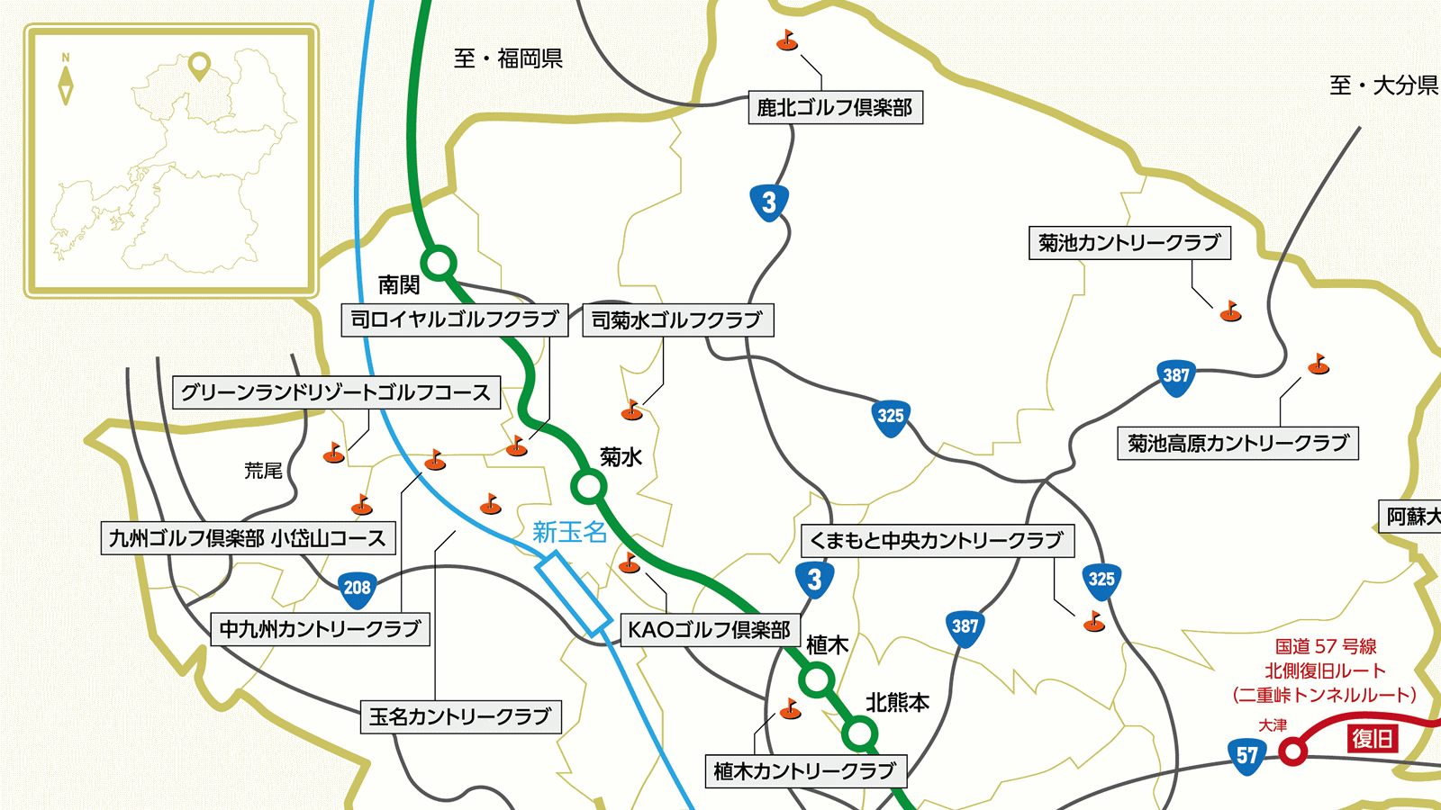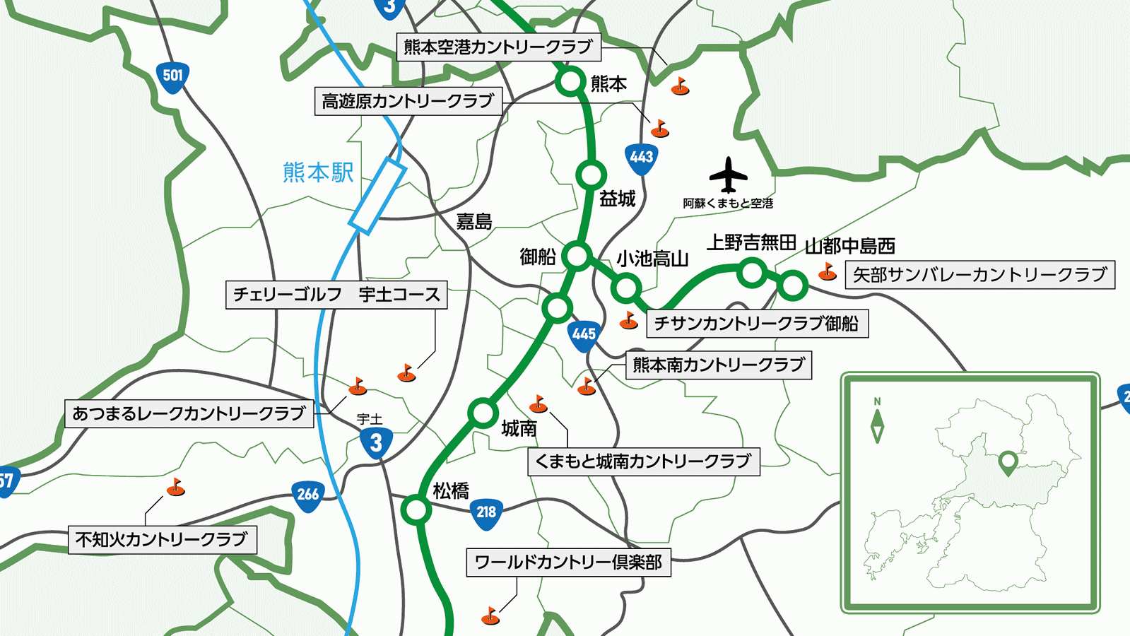 福岡県に隣接しているため、県外からのファンも多数。熊本県屈指の名門コースもあり、全般的に戦略性あふれるコースが多く、どのゴルフ場も歯ごたえ充分。北熊本スマートICの開通により、より便利に!