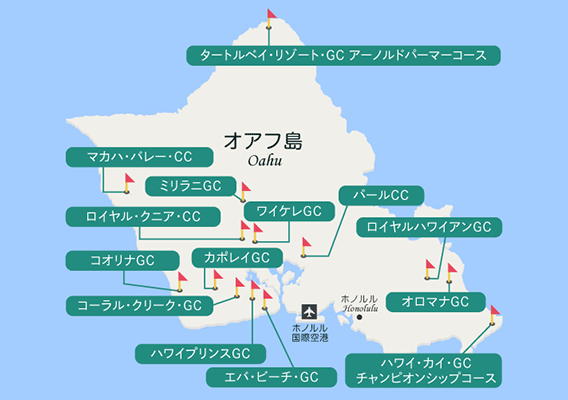 ホノルルがあるオアフ島。有名コースからパブリックコースまで、予約できる15以上のゴルフコースを一覧で見ることができます。